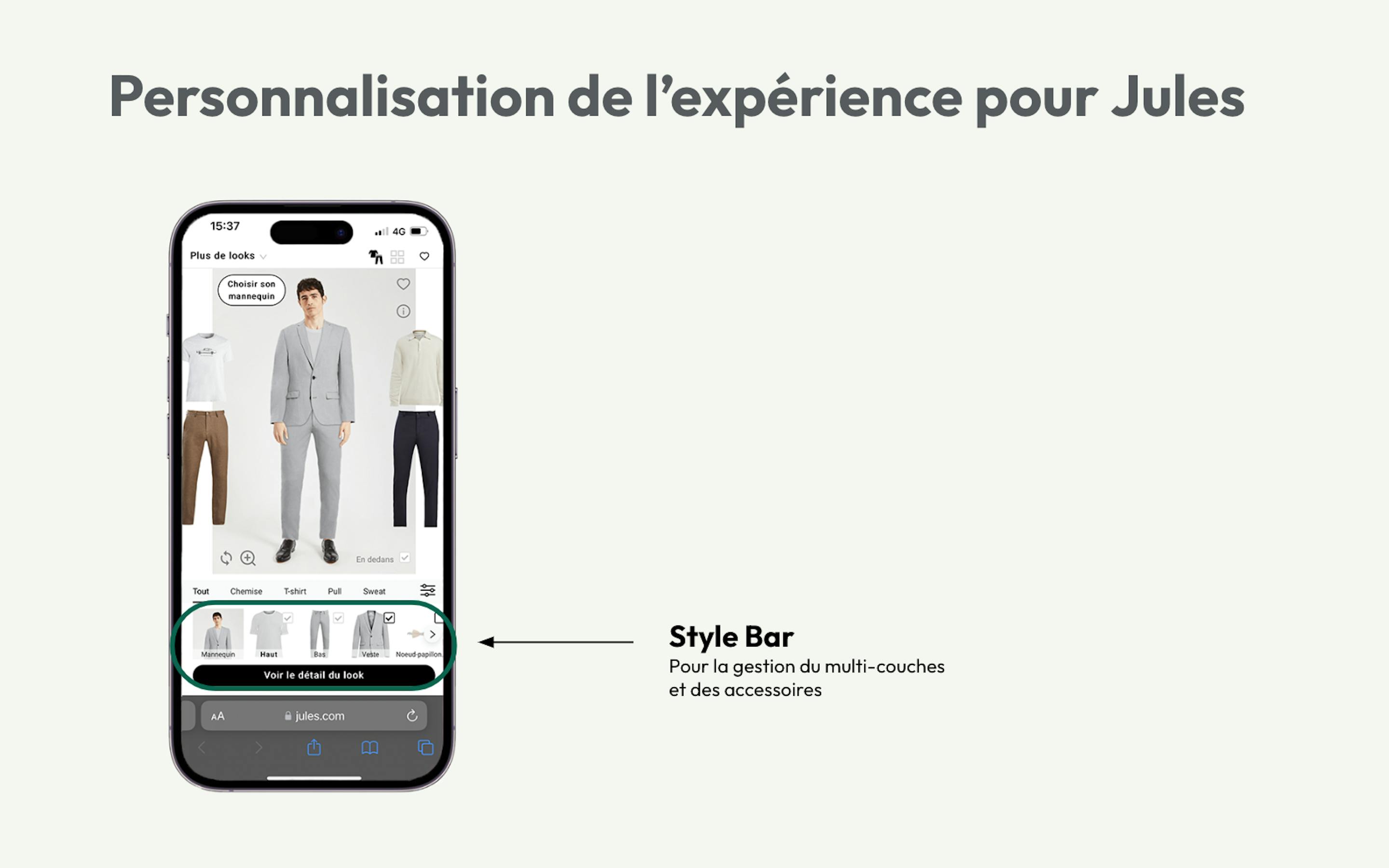 Pour rendre la navigation simple, Jules a souhaité mettre en avant une “style bar”, permettant aux clients de passer d’une catégorie à l’autre depuis une même page, et de créer leur looks en superposant différents produits : chemise/veste + accessoires/chaussures.