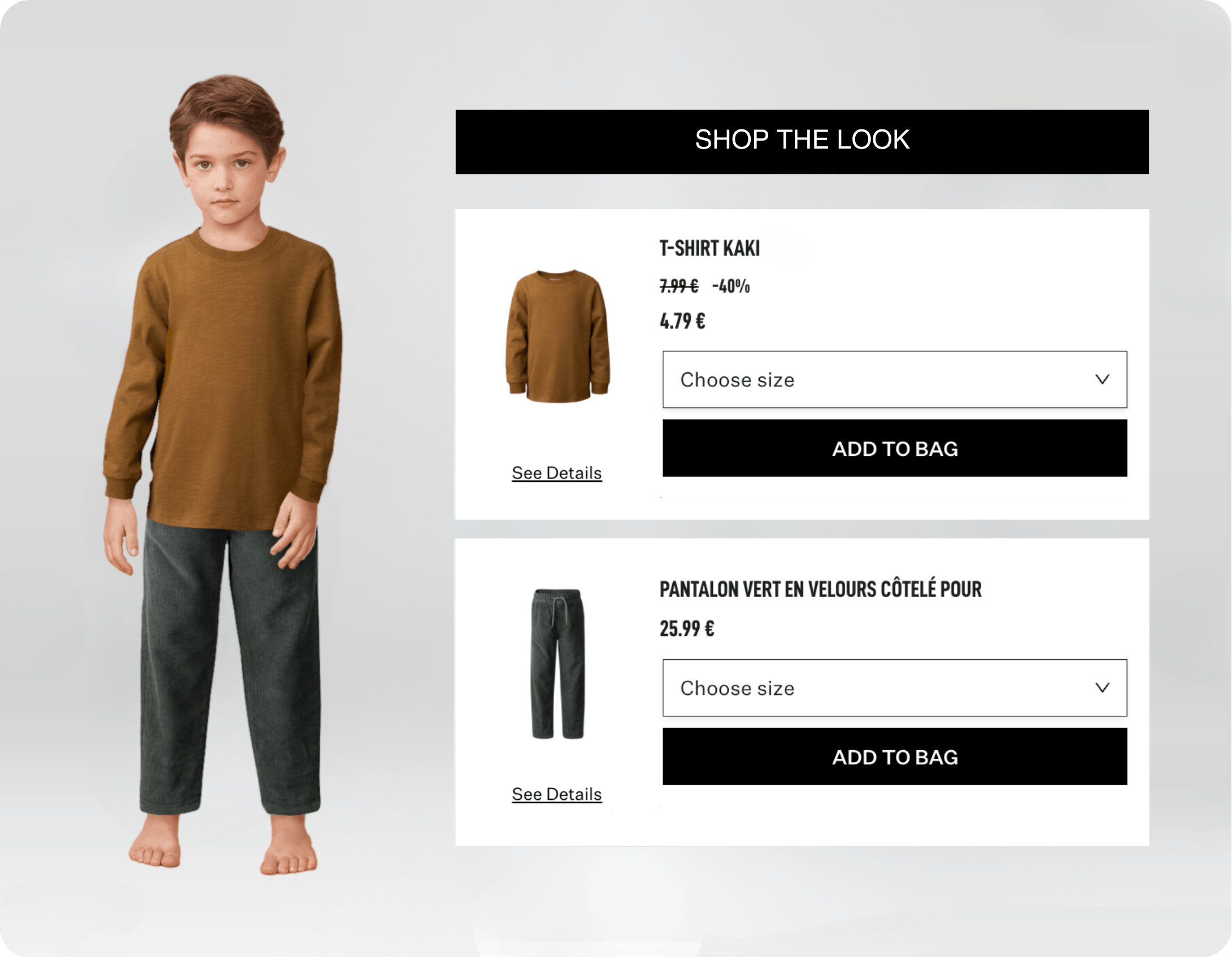 Parents can easily add full outfits directly to their cart from the styling experience, making the checkout process fast and simple.
